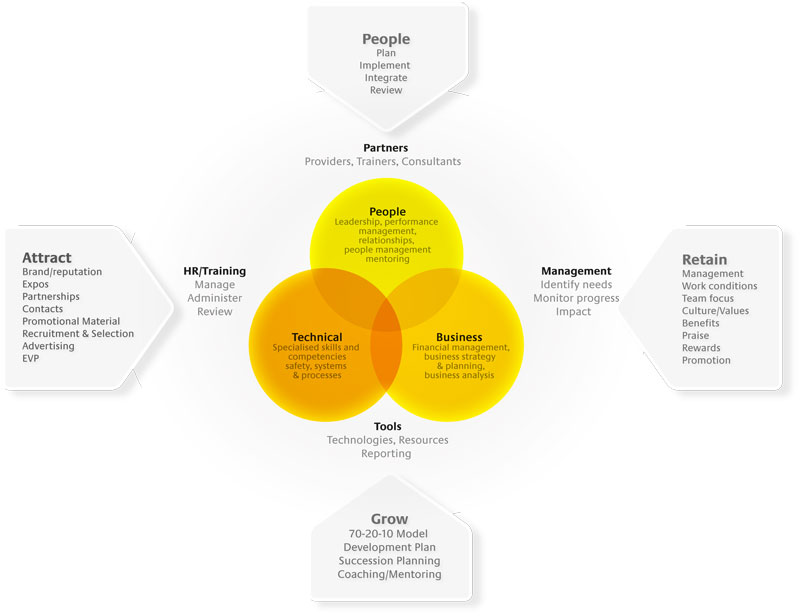 The above diagram illustrates Align HR's integrated people capability model approach. All businesses need to attract, retain and grow its people and each business has a culture and organisational philosophy that needs to be understood before any people and training solutions are established and aligned to impact on a business at any level.
